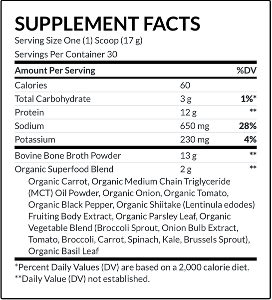 Our bone broth protein is made the same way you would make homemade broth – by simmering the bones until as many proteins and nutrients are extracted. Water and bones... that's it! We then use a gentle drying method to turn the broth into a powder.